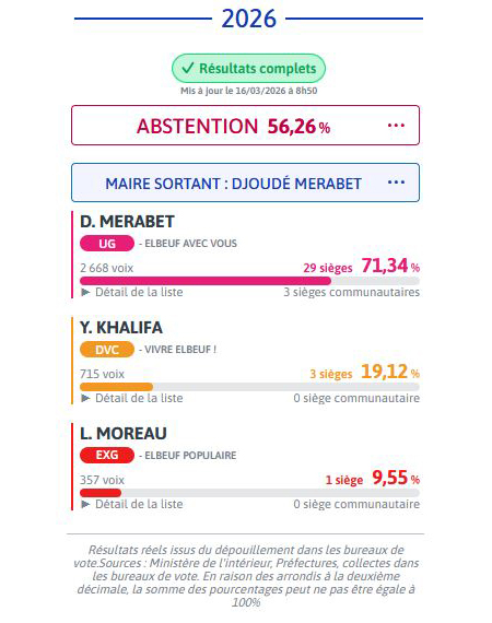 Découvrez les résultats du premier tour des élections municipales qui ont eu lieu à Elbeuf sur Seine le 15 mars 2026. La liste « Elbeuf avec vous » ayant remporté plus de 50% des voix, il n’y aura pas de second tour.