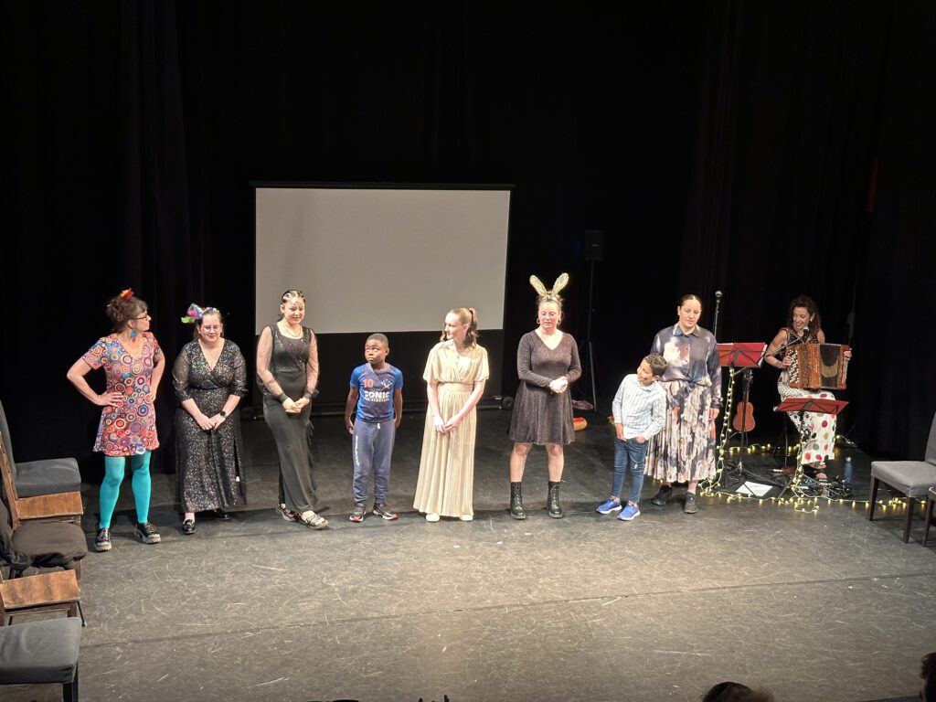Plusieurs temps de répétition ont été organisés en amont, permettant aux participants de construire le spectacle collectivement et d’apprendre à se connaître. Deux représentations ont eu lieu : le matin avec les enfants et les parents du PRE, puis l’après-midi avec les adolescents et les seniors.